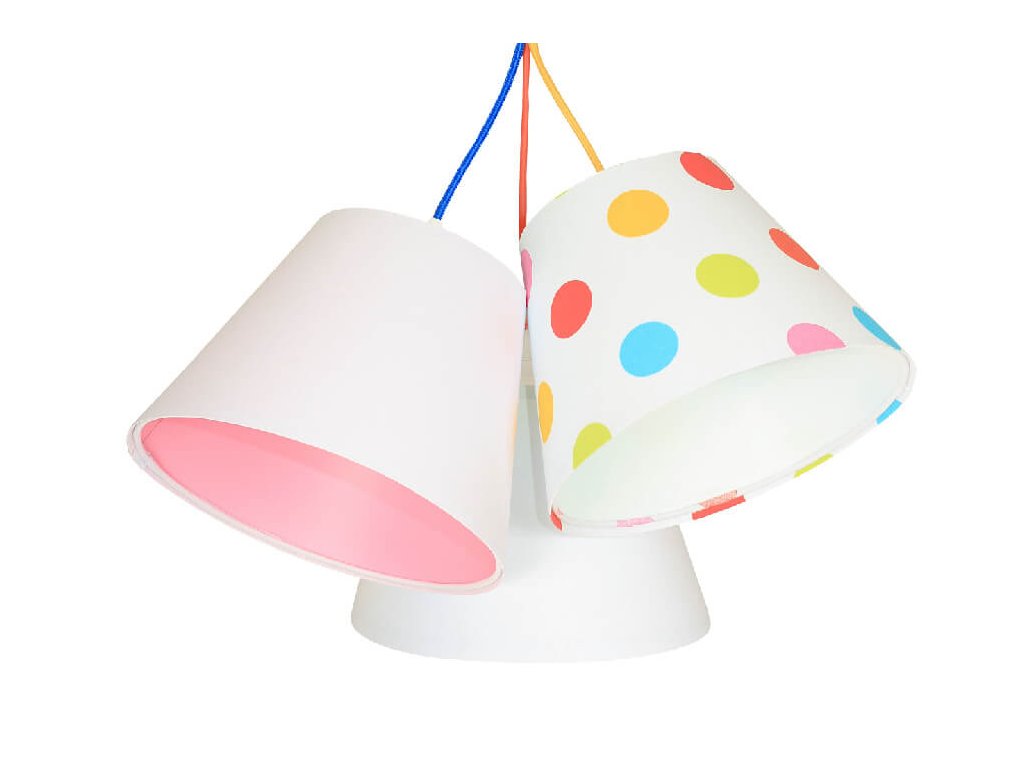 Kabelem spojená stínidla mají různé kombinace bílé, růžové a barevných puntíků.