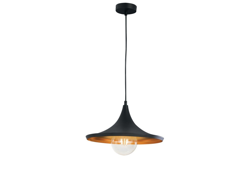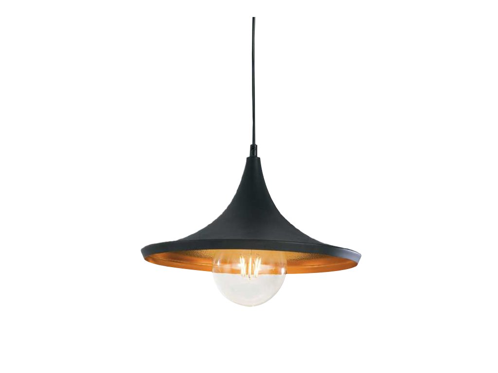 Kovové stínidlo má černou barvu, uvnitř je měděné, čímž získává na jemnosti.