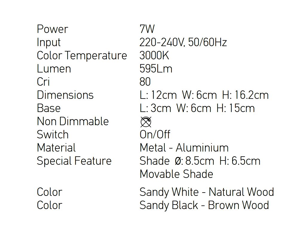 Základna a stínidlo jsou z hliníku. Stínidlo je možno mírně natáčet.