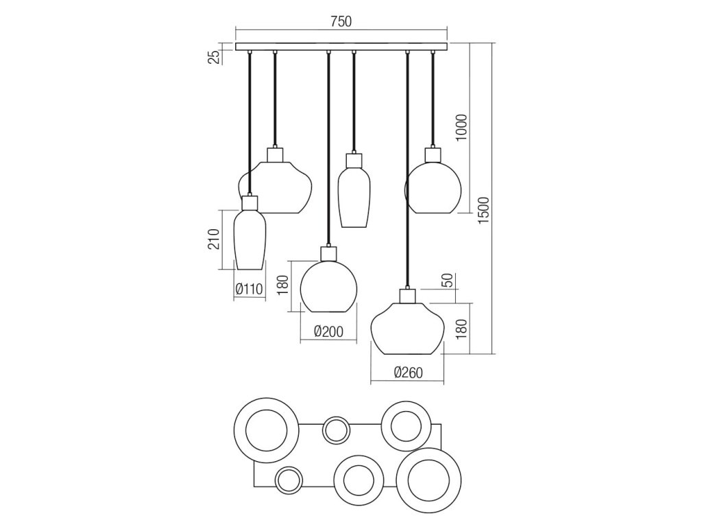 Na černé oválné základně je šest stínidel ve třech velikostech.