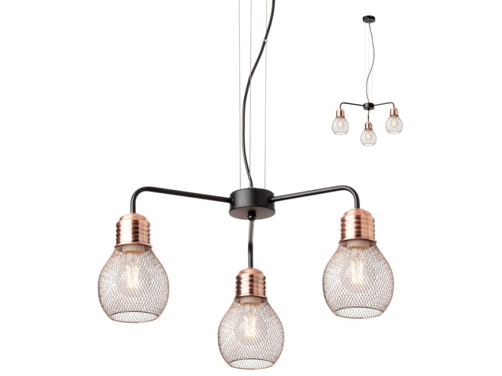 Jednoduchá černá konstrukce nese ozdobná stínidla vyrobená z efektní kovové síťoviny v barvě mědi.