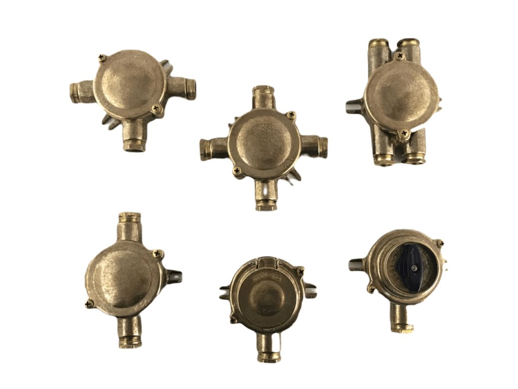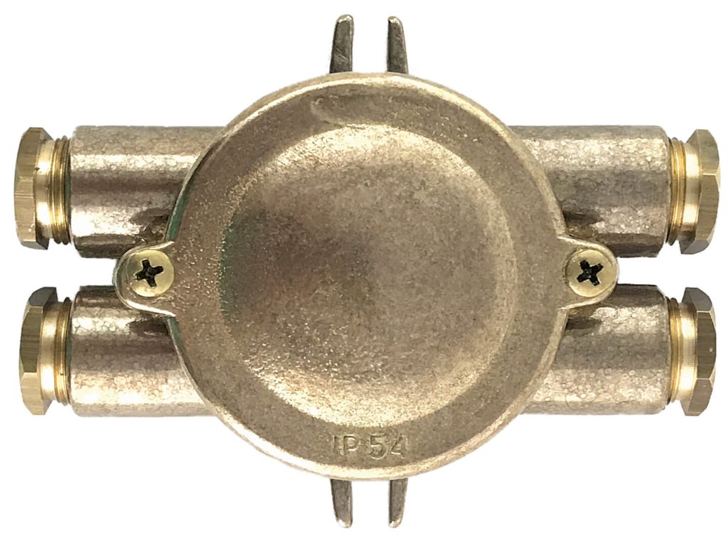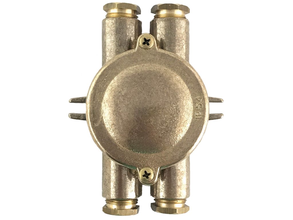 Vintage elektroinstalační krabice na fasádu z masivní mosazi se čtyřmi vývody.