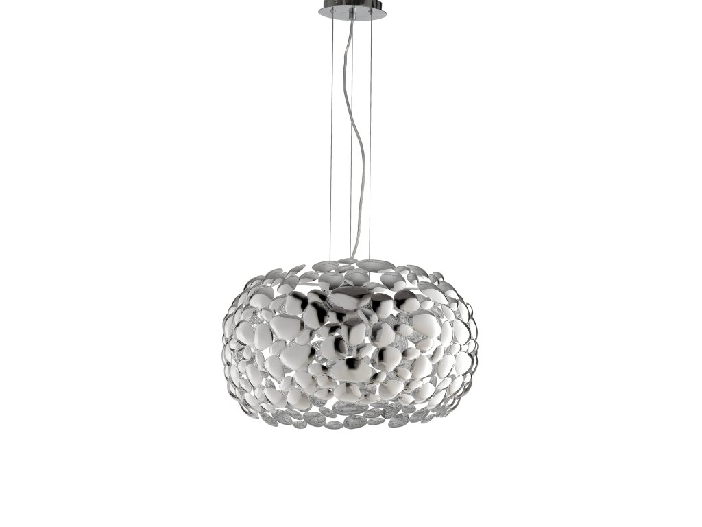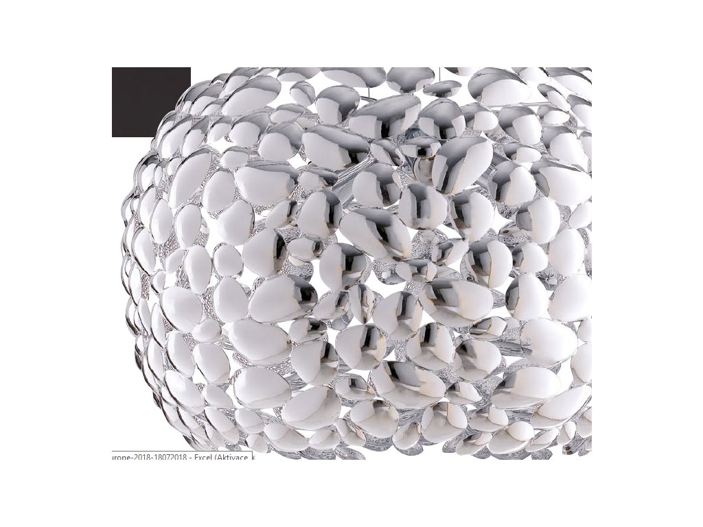 Výškově nastavitelný lustr vytváří světelné efekty v celé místnosti, díky chromovanému kovu v podobě malých oblázků.