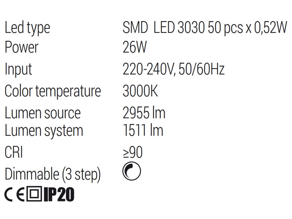 - LED zdroje: Příkon 26W zajišťuje efektivní a úsporné osvětlení, které šetří energii a má dlouhou životnost.