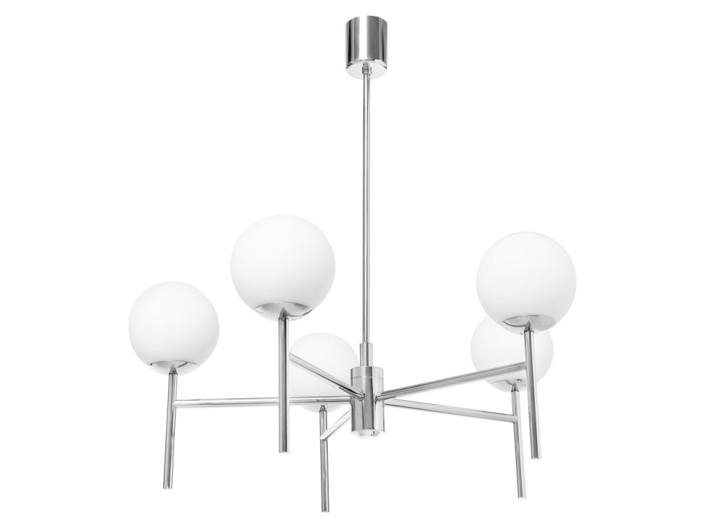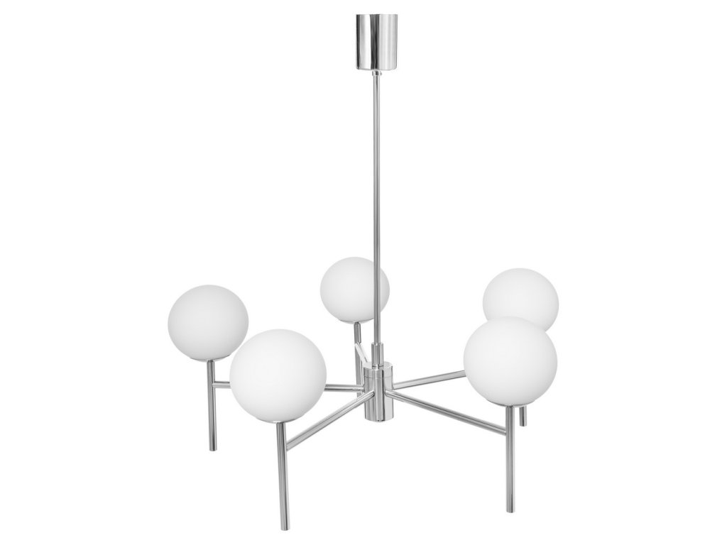 Závěsné svítidlo KASPA Aero 11042503 je tradičním spojením ramen z lesklého kovu a koulí z bílého skla.