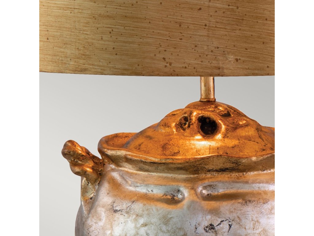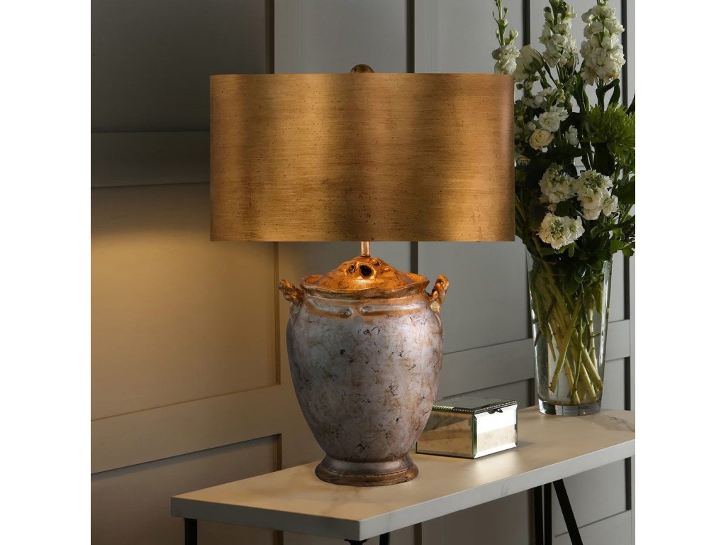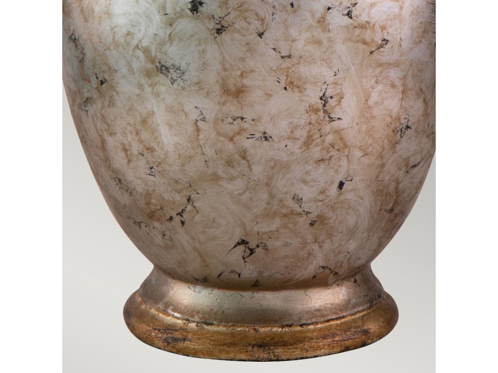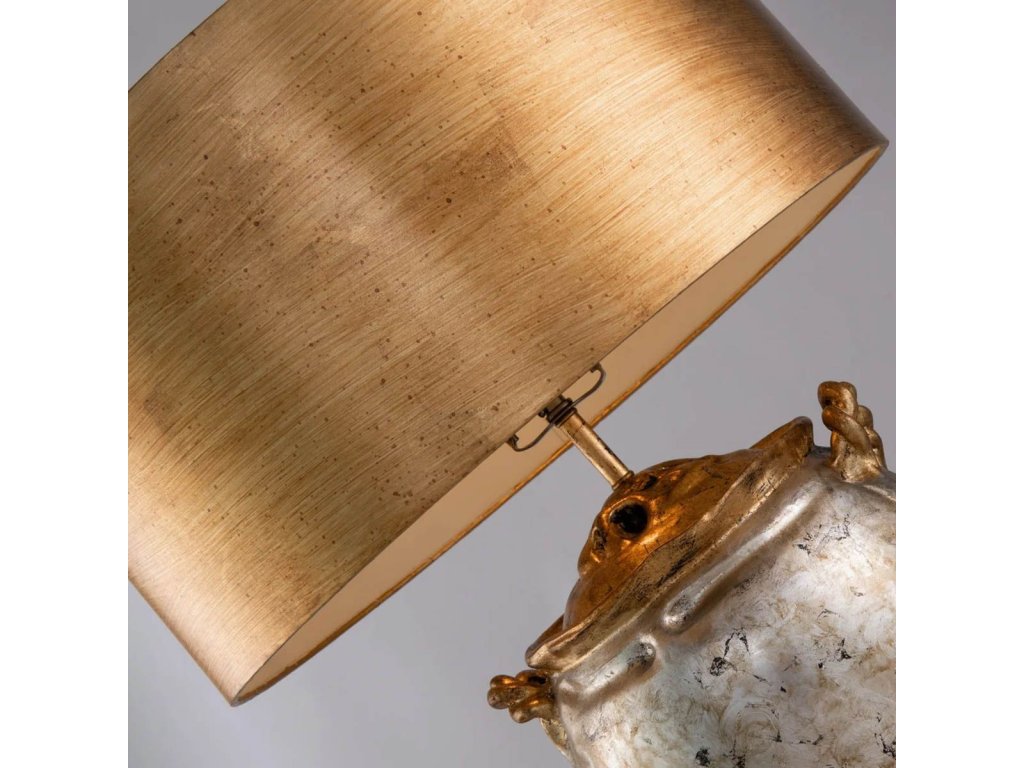 Kovová základna lampy v patinovaném stříbrno-zlatém provedení není jen zdrojem světla, ale skutečným uměleckým dílem. Tvar karafy dodá rustikálnímu interiéru jedinečný charakter a mystický půvab.