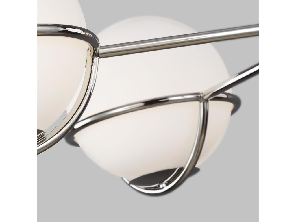 Čistý design s bílými skly, zapadne do moderních i retro interiérů. Bílá stínidla z leptaného skla ve tvaru koule jsou usazena v kruhových rámech. Kosmická inspirace a umělecký šarm v kombinaci s modernistickým designem zajistí, že se toto osvětlení stane ústředním bodem každé místnosti.