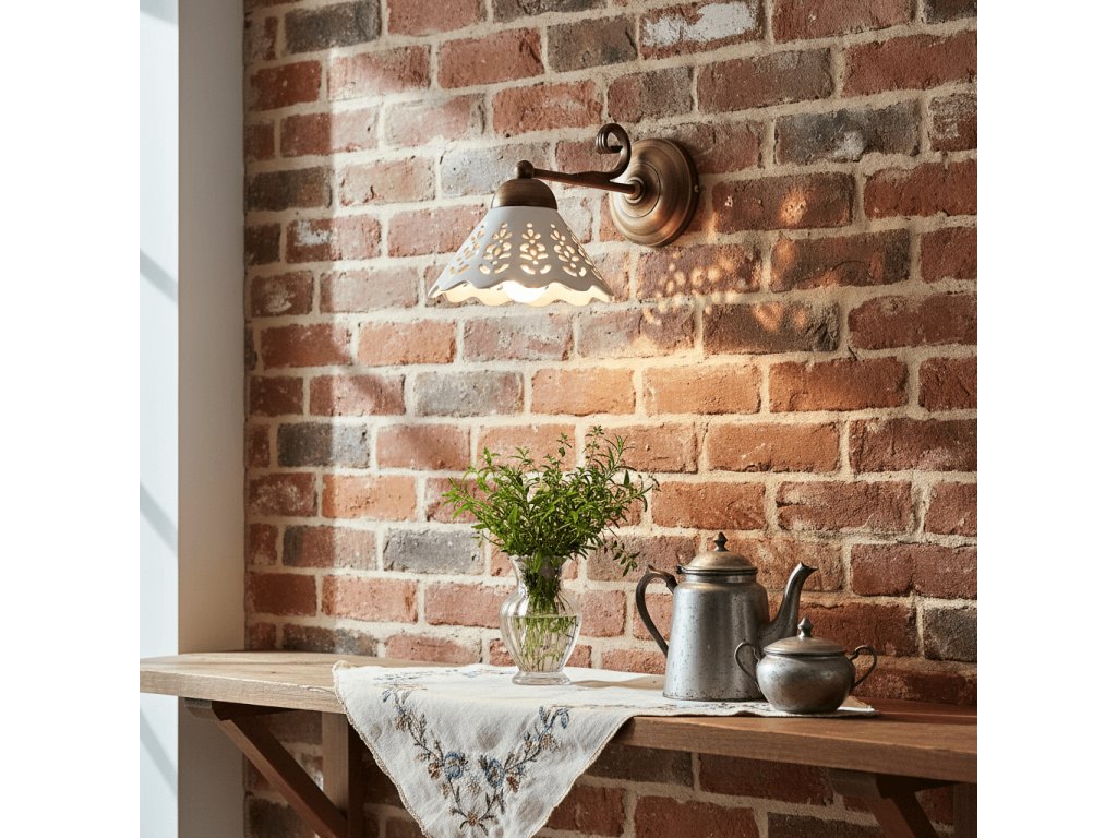 Historizující stínidlo z bílé keramiky je zdobeno perforovaným květinovým vzorem. Okraje sukýnky jsou zaoblené.
