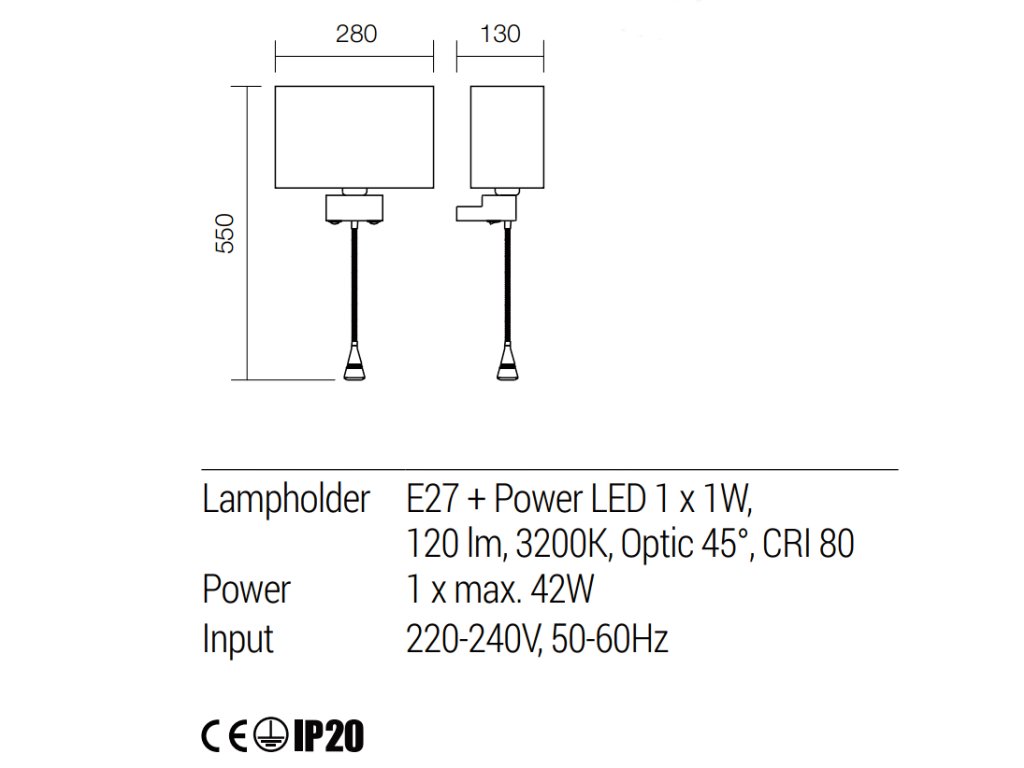 | Specifikace: | 1 x E27 max.42W 230V + LED 1W 120LM |