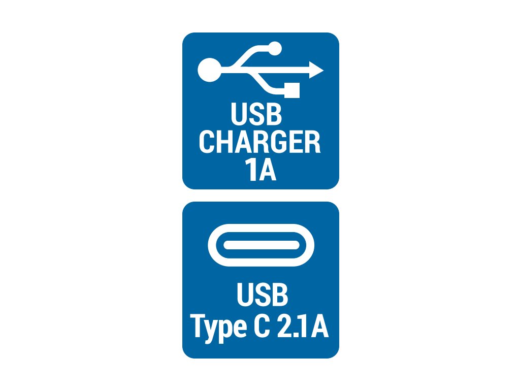 USB porty: Dva nabíjecí porty USB typu A a C s výkonem 2,1 A pro pohodlné nabíjení vašich zařízení.