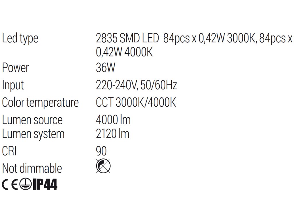 - Světelný výkon: 36W 2120 lm u barvy 4000K