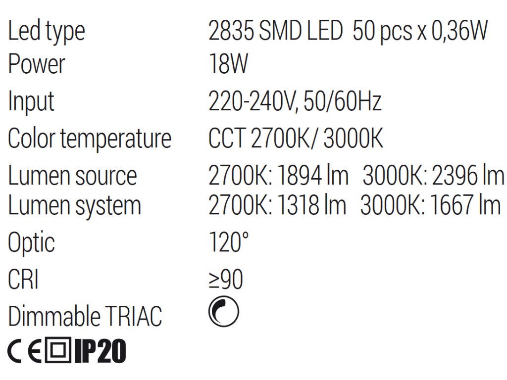 - LED zdroje: Příkon 18W zajišťuje efektivní a úsporné osvětlení, které šetří energii a má dlouhou životnost.
