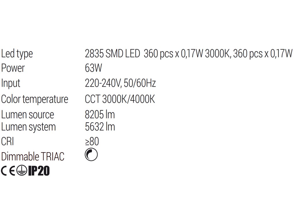 - Výkon: 63W SMD LED diody umístěné na spodní straně obruče v matné akrylátovém difuzoru.