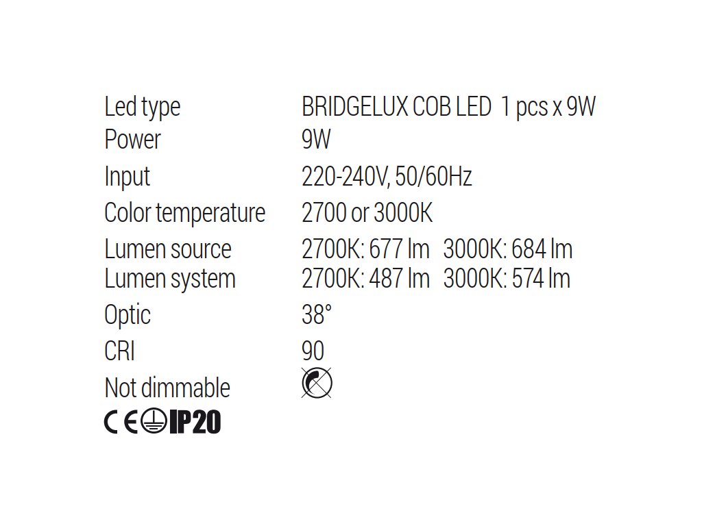 - Výkonné osvětlení: Svítidlo disponuje COB LED technologií s příkonem 9W a teplotou barvy 2700K, což zajišťuje teplé a příjemné světlo.
