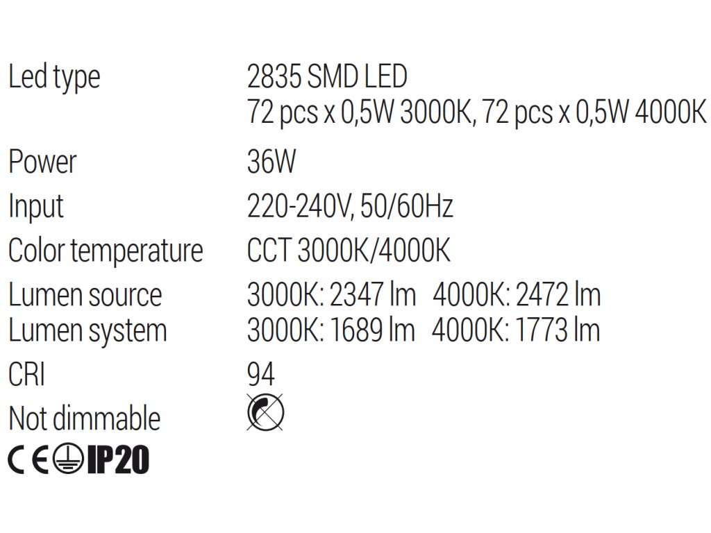 - CCT funkce: Možnost nastavení barvy světla (CCT) umožňuje vybrat si při montáži teplou nebo neutrální barvu světla 3000K - 4000K a přizpůsobt tak produkt vašim preferencím.