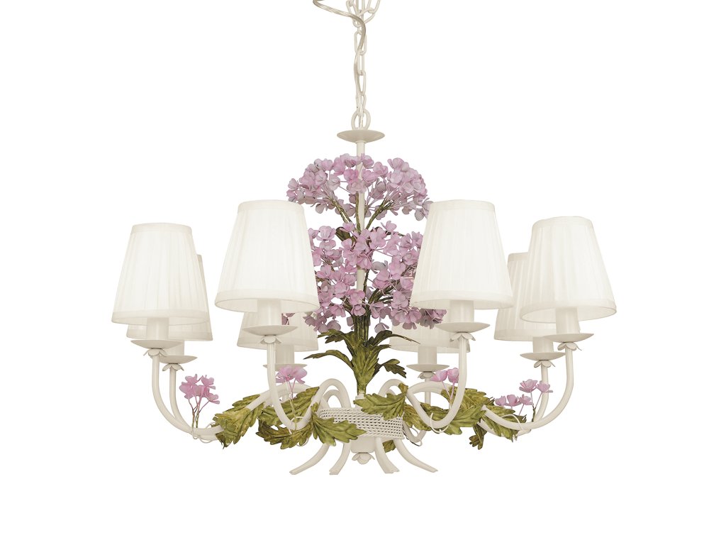 Romantický lustr s osmi rameny a barevným florálním motivem květů hortenzií Faneurope Ortensia.
