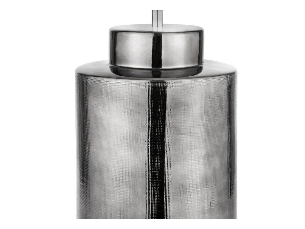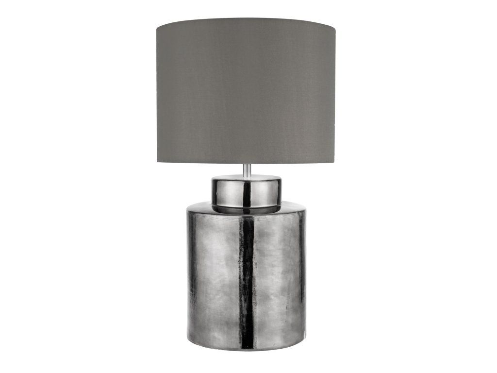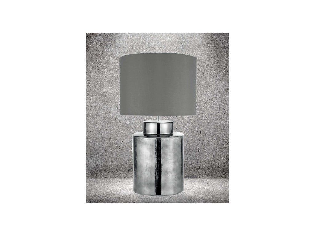 Masivní tělo svítidla je z keramiky v chromové stříbrné barvě a stínidlo z šedé látky podlepené akrylátovou výztuží.