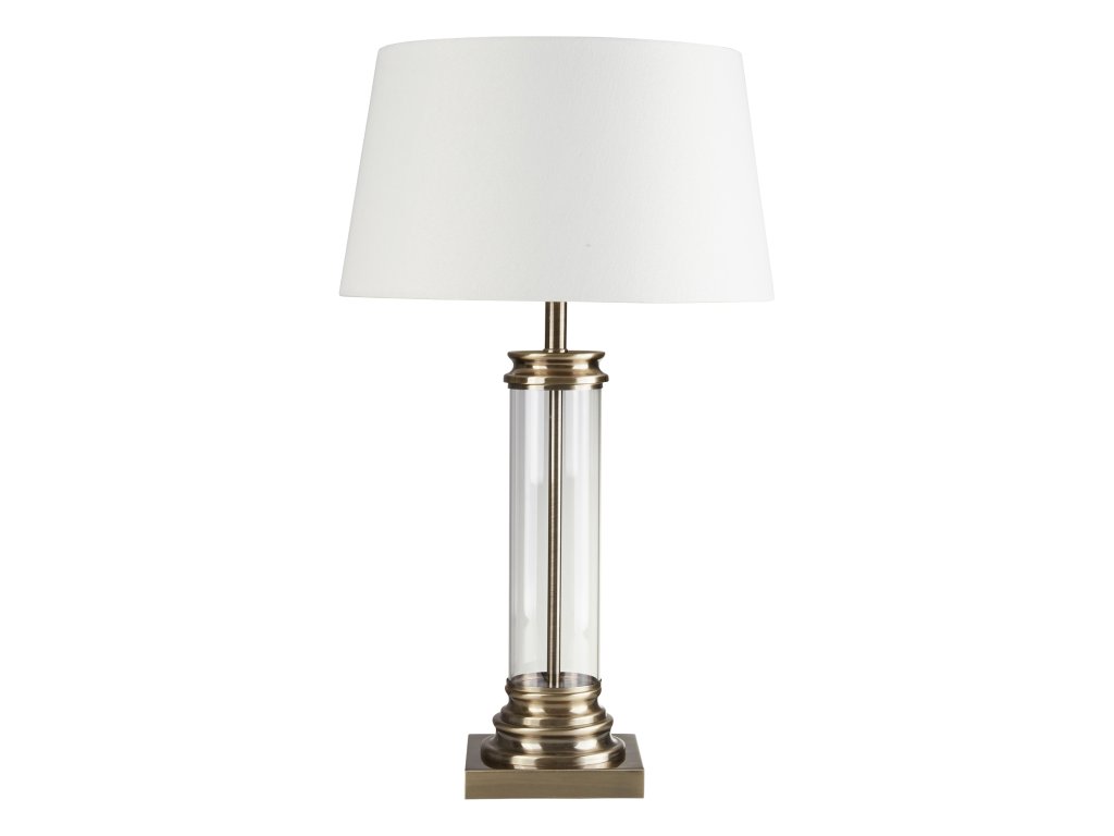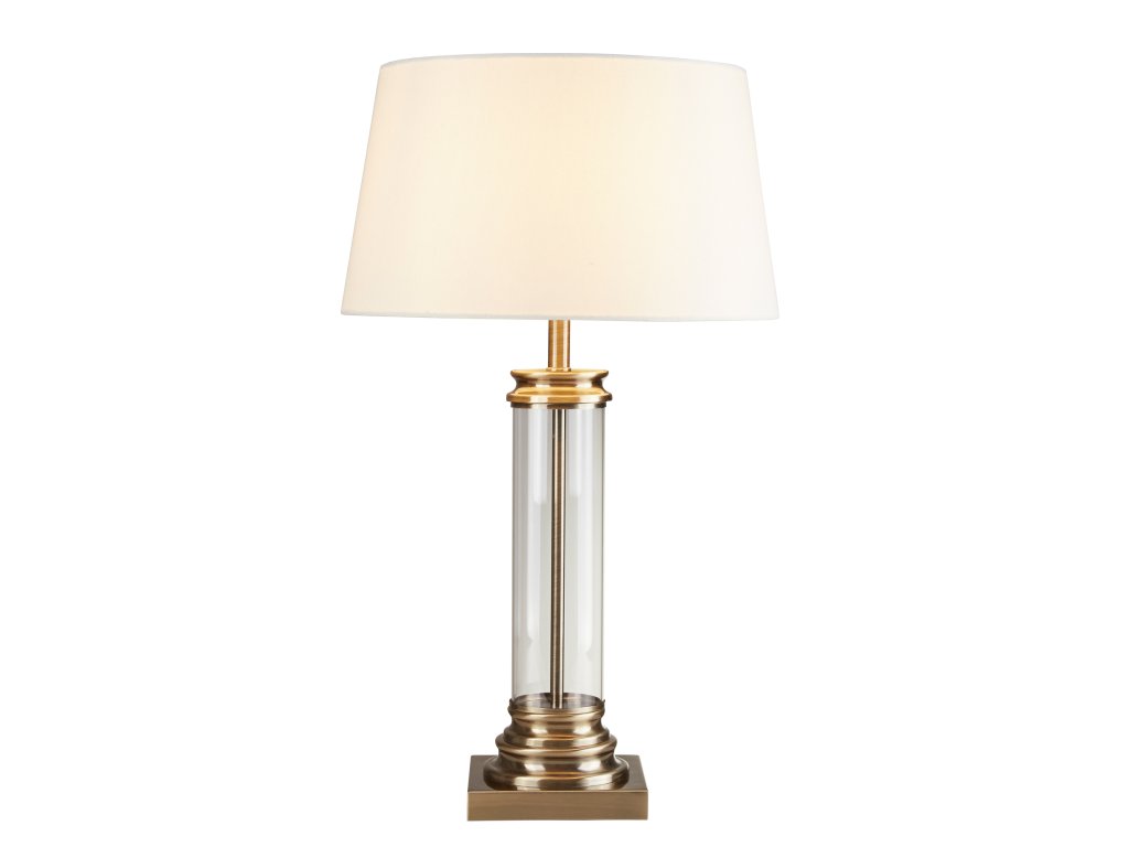 Kombinace skleněného tubusu, antické mosazi a textilního stínidla evokuje starožitné lampy.