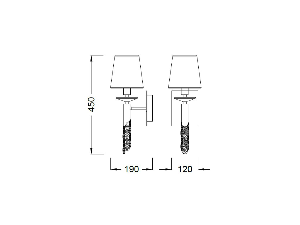 Provedení je v antické mosazi, broušené sklo, hedvábná stínidla v barvě koňaku které jsou podsvícené zdrojem s paticí G9.