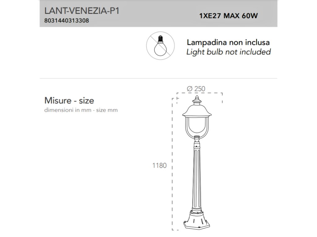 Venkovní sloupková lampa s krytím IP44 pro použití k chodníku Faneurope Venezia.