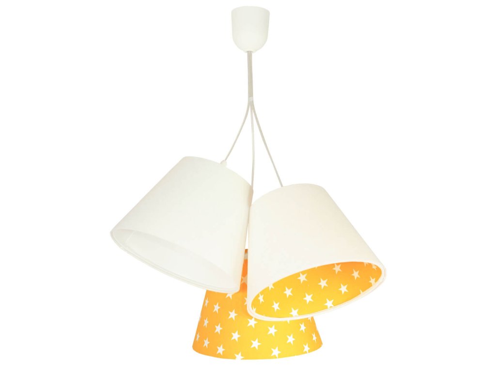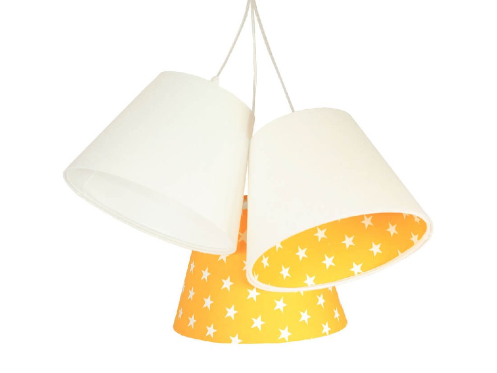 Dětský lustr se třemi stínidly z velurové látky podlepené bílým plastem.